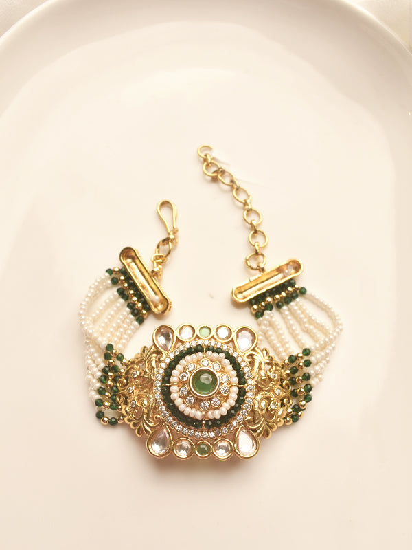 This stunning bracelet combines the elegance of golden Kundan detailing with the charm of premium beads and sparkling stones. Designed to blend traditional beauty with modern flair, it features intricate craftsmanship that enhances its luxurious appeal. The beads add a soft, stylish touch, while the Kundan work brings a regal finish, making it perfect for festive events, weddings, and special occasions. Lightweight and comfortable, it sits smoothly on the wrist and pairs beautifully with ethnic and Indo-western outfits. Whether you're looking for a statement piece or a unique accessory for everyday glam, this bracelet adds timeless grace to any look.