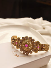 This elegant golden bracelet adorned with soft pink stones is the perfect blend of beauty, charm, and sophistication. Designed with intricate detailing, it adds a graceful touch to your wrist, making it ideal for festive occasions, parties, and everyday elegance. The pink stones offer a subtle pop of colour that complements both traditional and western outfits. Crafted with high-quality materials, the bracelet ensures durability, long-lasting shine, and a comfortable fit. Lightweight yet eye catching, it stands out as a statement accessory for women who love refined and feminine jewellery. A must-have piece that enhances your style effortlessly.