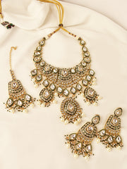 A bold and dramatic Bridal Kundan Necklace Set featuring oversized stones and exquisite detailing. Perfect for brides who want a striking, statement-making look. Comes with matching earrings and tikka for a complete, grand bridal ensemble.
