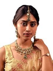 Make your special day unforgettable with this exquisite Bridal Kundan Necklace Set. Designed to radiate traditional charm, the set features a beautifully handcrafted necklace adorned with intricate Kundan work, paired with matching earrings and maang tikka for a complete bridal look. The rich detailing and regal design reflect timeless elegance, perfect for weddings and grand celebrations. Crafted with care using premium materials, it ensures both beauty and durability. The set's classic appeal complements a variety of bridal outfits, adding a royal touch to your ensemble. A must-have for every bride, this necklace set captures the essence of cultural heritage and grace.