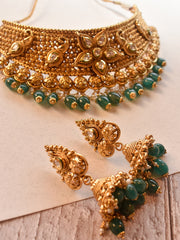 Elevate your jewelry collection with this exquisite Gold Choker Necklace. This beautiful piece is crafted from high-quality gold that shines and sparkles brilliantly in the light. The choker style is timeless and versatile, making it perfect for both casual and formal occasions. The necklace features a classic design that is both elegant and sophisticated, embellished with green beads and kundan stones to complete the look. The simple, yet stylish, design of the necklace is sure to complement any outfit. The necklace sits comfortably on the neck, enhancing your neckline and adding a touch of sophistication to your look. The Gold Choker Necklace is paired with beautiful pair of earrings in the form of jhumkas to complete the look. Crafted with the utmost care and attention to detail, this Gold Choker Necklace is a true masterpiece. The necklace is made from high-quality gold that is hypoallergenic and safe for sensitive skin. It is also durable and resistant to tarnishing, ensuring that it will remain in excellent condition for years to come.
