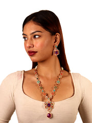 This colorful long necklace set features vibrant multi-color beads and a striking purple stone pendant. Lightweight and elegant, it suits festive, casual, and Indo-western looks beautifully.