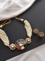 The choker's design perfectly balances tradition and contemporary aesthetics. The fusion of white pearls and Kundan work creates a harmonious blend that effortlessly complements a range of outfits, from traditional Indian ensembles to modern Western attire. Whether worn with a saree, an evening gown, or even a simple blouse, this choker elevates your overall look with its understated elegance and timeless appeal.