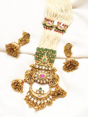 This Traditional Necklace Set showcases exquisite craftsmanship with its ornate golden design and vibrant green and pink stones. Perfect for weddings and festive occasions, it adds a regal touch to any ethnic look. The set includes matching earrings, making it a complete and timeless addition to your jewellery collection.