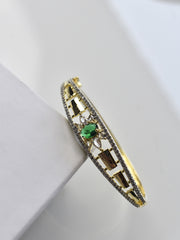 These Green Stone Bracelets with a golden frame exude elegance and sophistication. The vibrant green stones, carefully set in the sleek gold-tone design, create a striking contrast, adding a refreshing touch of color to any outfit. Perfect for both casual and formal occasions, these bracelets offer versatility and timeless appeal. The durable construction ensures longlasting wear, while the elegant design makes them a standout accessory. Whether worn alone for a minimalist look or paired with other pieces for a bolder statement, these Green Stone Golden Bracelets are an essential addition to any jewelry collection, offering both style and luxury.