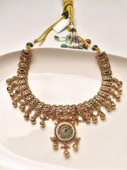 A beautifully crafted necklace set featuring green and red stones on a radiant golden base. Rich, elegant, and perfect for weddings or festive occasions, it adds traditional charm and color to any ethnic outfit.